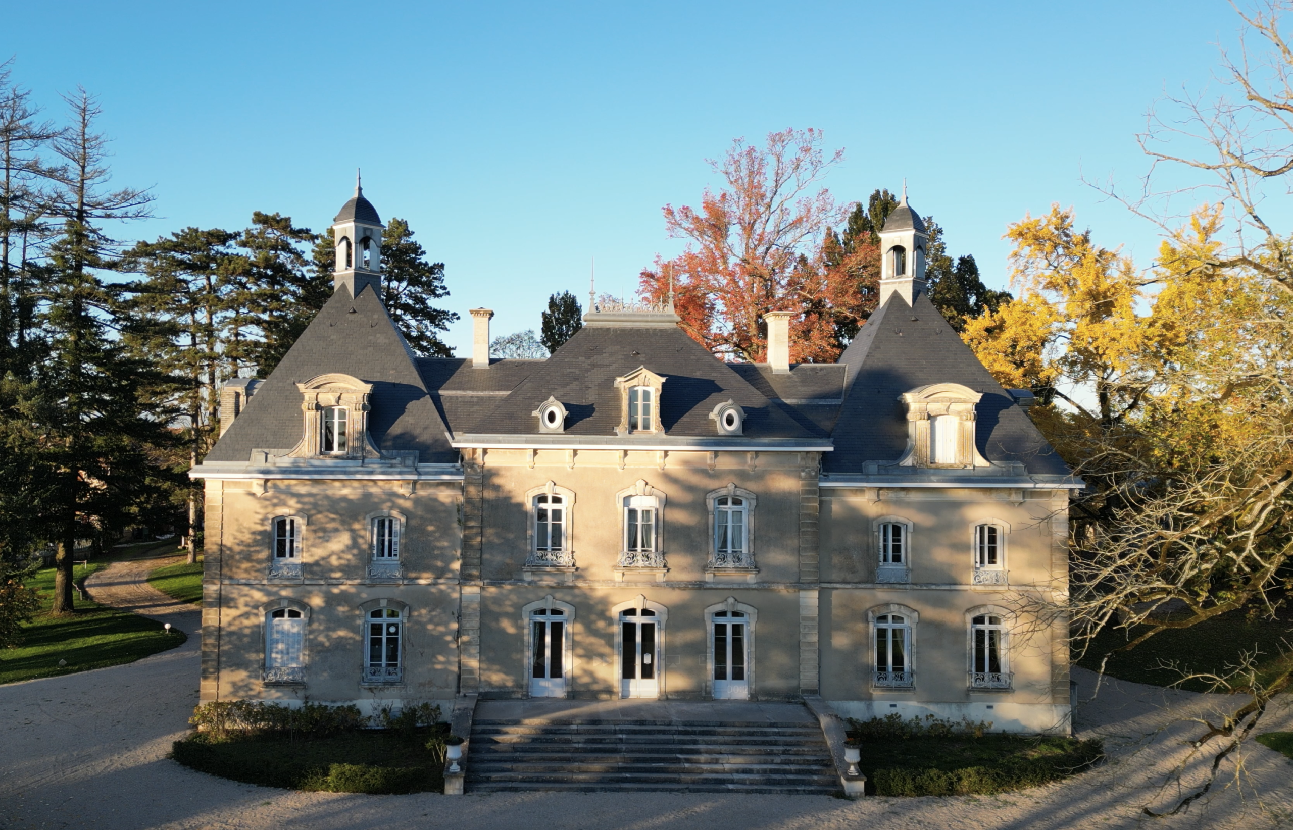Vue d’une maison historique rénovée à Saint-Cyr-au-Mont-d'Or, avec une toiture en ardoise ornée de motifs géométriques, entourée de verdure et de jardins paysagers.